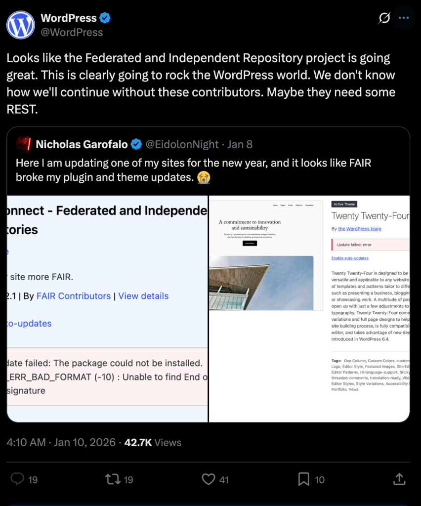 It is now 2026, and the official WordPress account on X has thrown the first jab of the year. On Saturday the account made a sarcastic remark about the FAIR Package Manager. The post was originally open for comments, but has since been locked and many of the comments of people being upset about it were hidden.